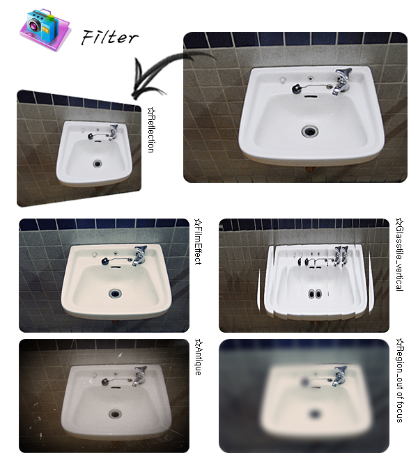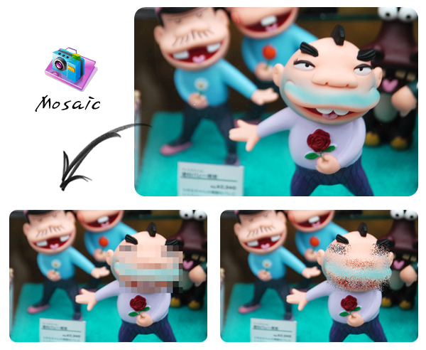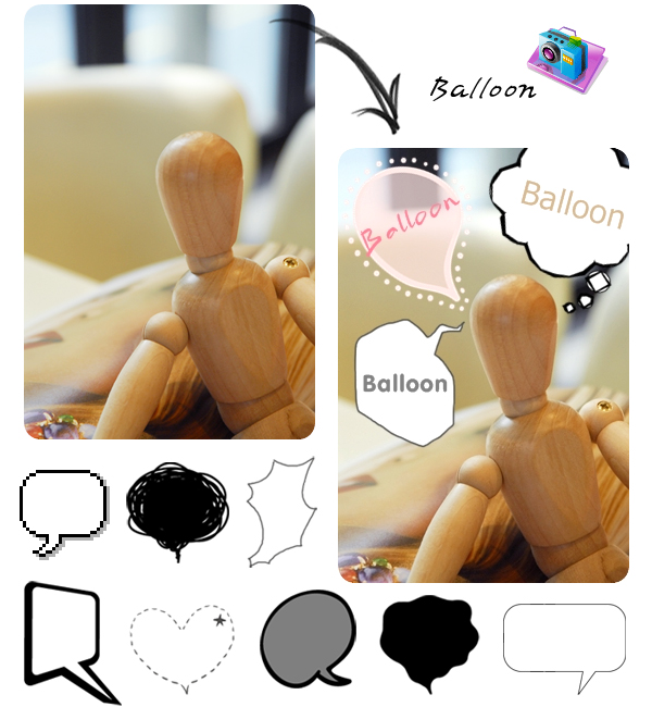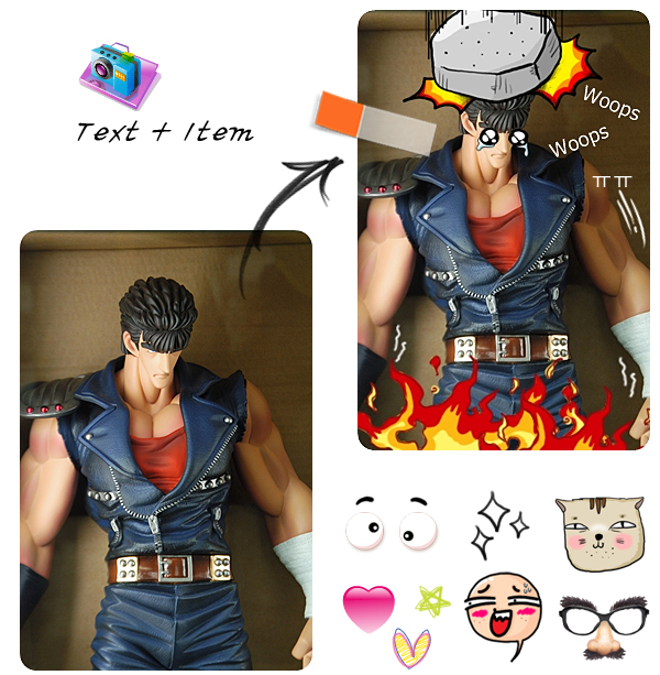 -사진편집: 크기/밝기/색상 조절, 역광보정, 액자, 말풍선, 모자이크, 글쓰기, 그리기, 자르기, 필터, 적목보정, 뽀샤시, 복제도장툴이 있습니다.